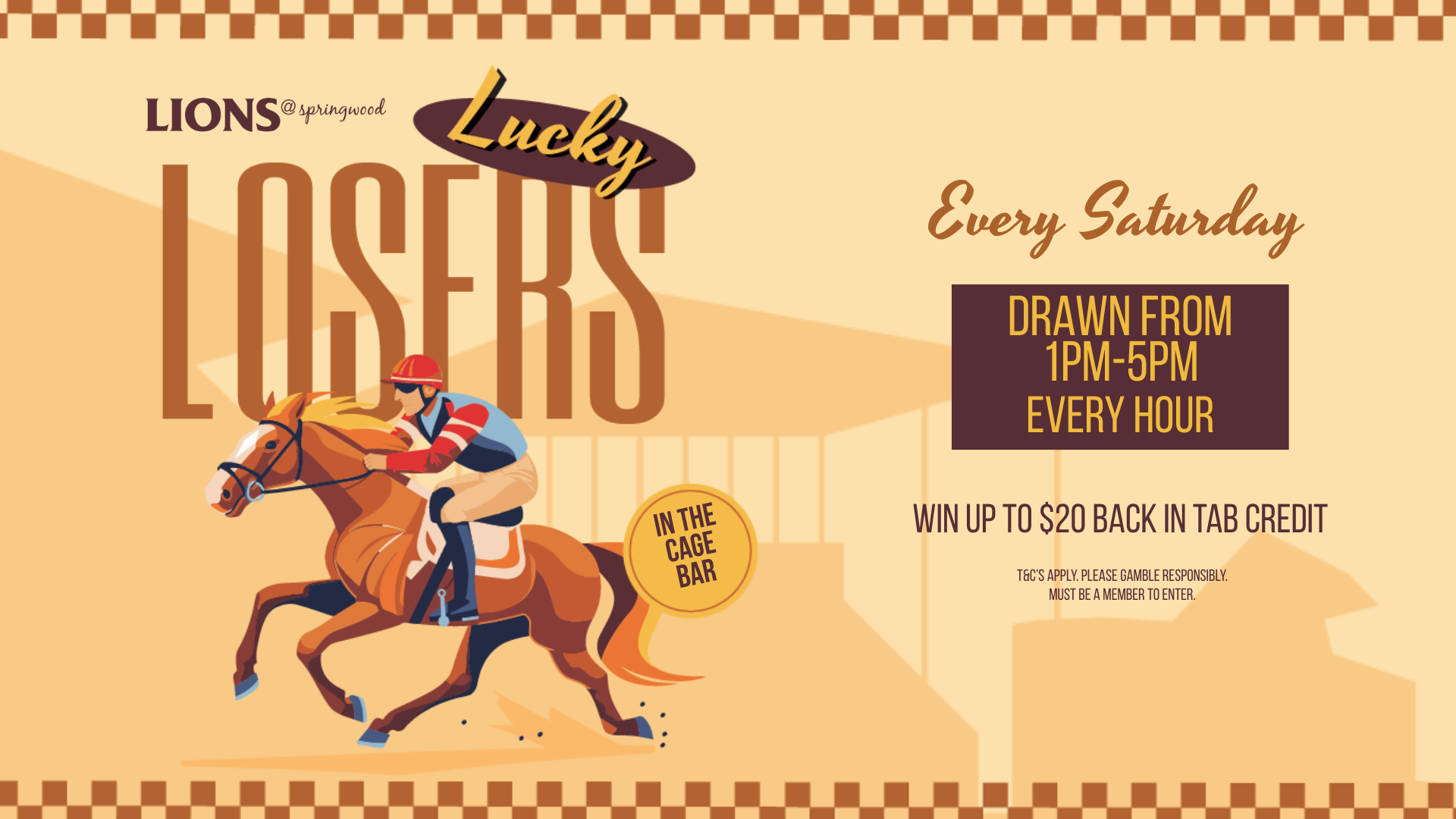 Place your losing TAB tickets into the barrel in The Cage Bar every Saturday from 1pm–5pm for hourly draws and your chance to score up to $20 back in TAB credit.