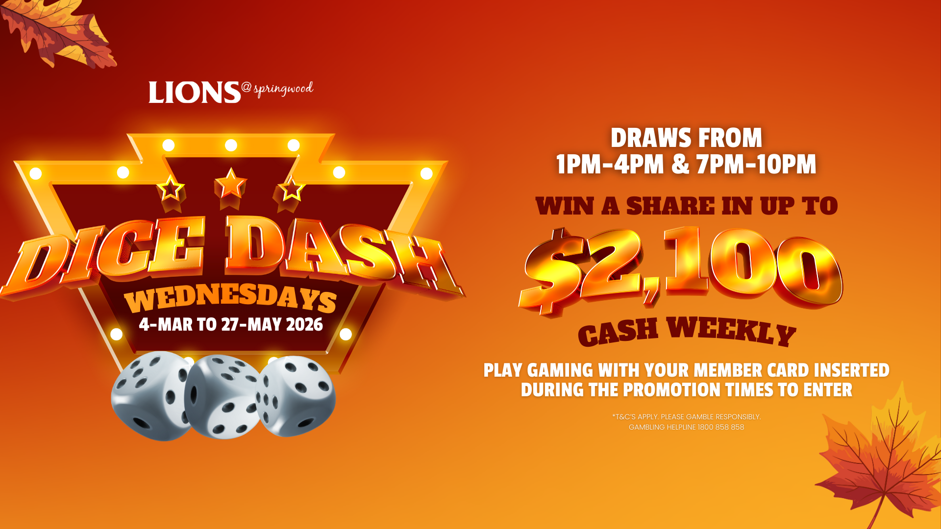 Wednesdays | 4 March – 27 May 2026 Dice Dash Gaming Promotion – Lions@Springwood Draws every Wednesday from 1pm–4pm and 7pm–10pm Win a share in up to $2,100 cash weekly... Read more »