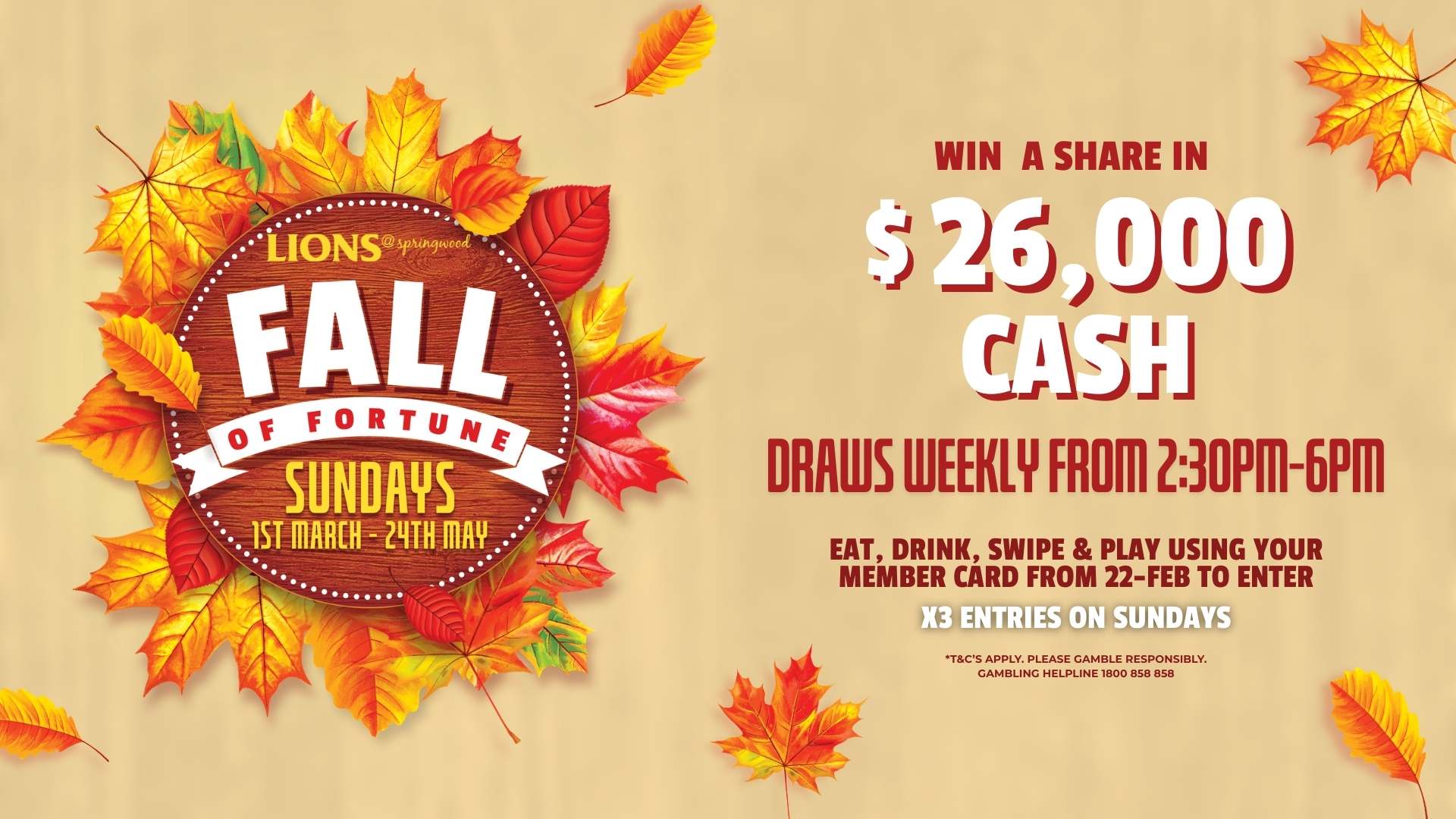 Sundays | 1 March – 24 May 2026 Fall of Fortune Major Promotion! Win a share in $26,000 CASH! Draws weekly every Sunday from 2:30pm-6pm. Eat, drink, swipe and play... Read more »