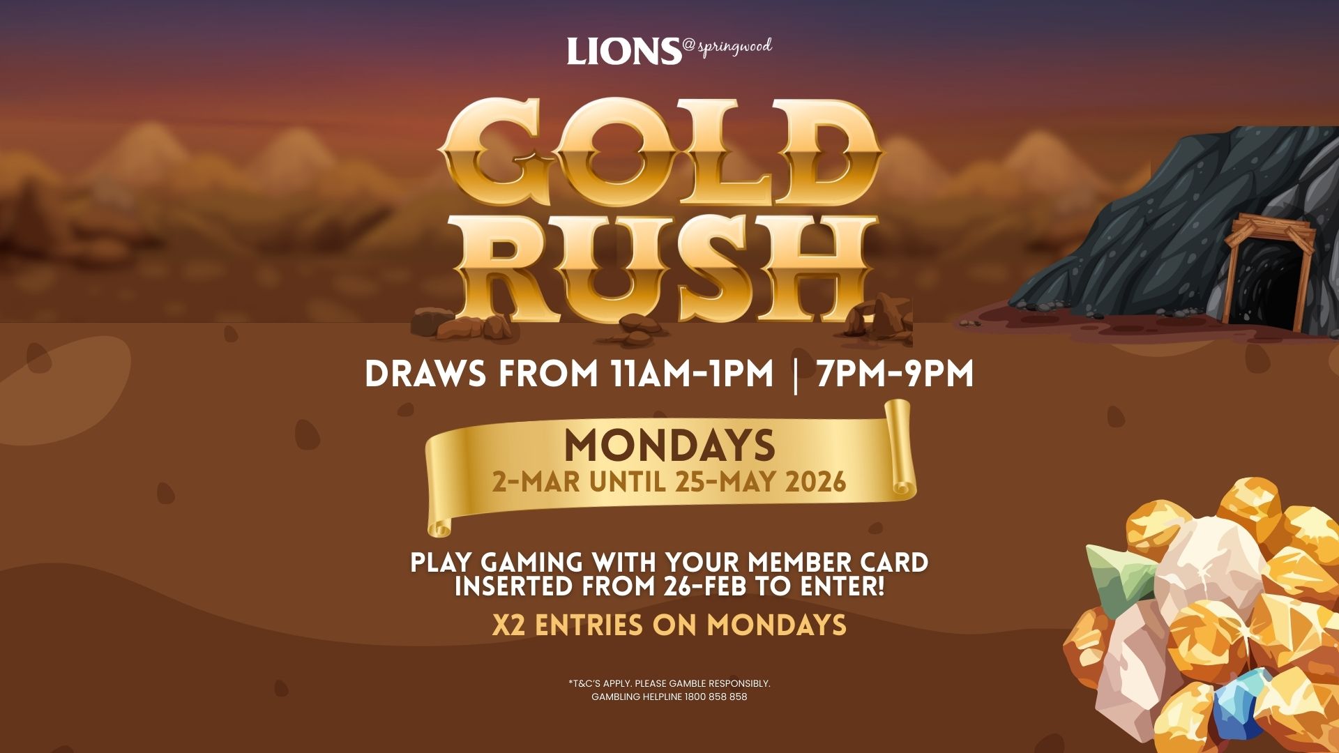 Mondays | 2 March – 25 May 2026 Gold Rush Promotion! Win a share in $1,400 CASH. Draws every Monday from 11am–1pm and 7pm–9pm. Play gaming with your member card inserted... Read more »