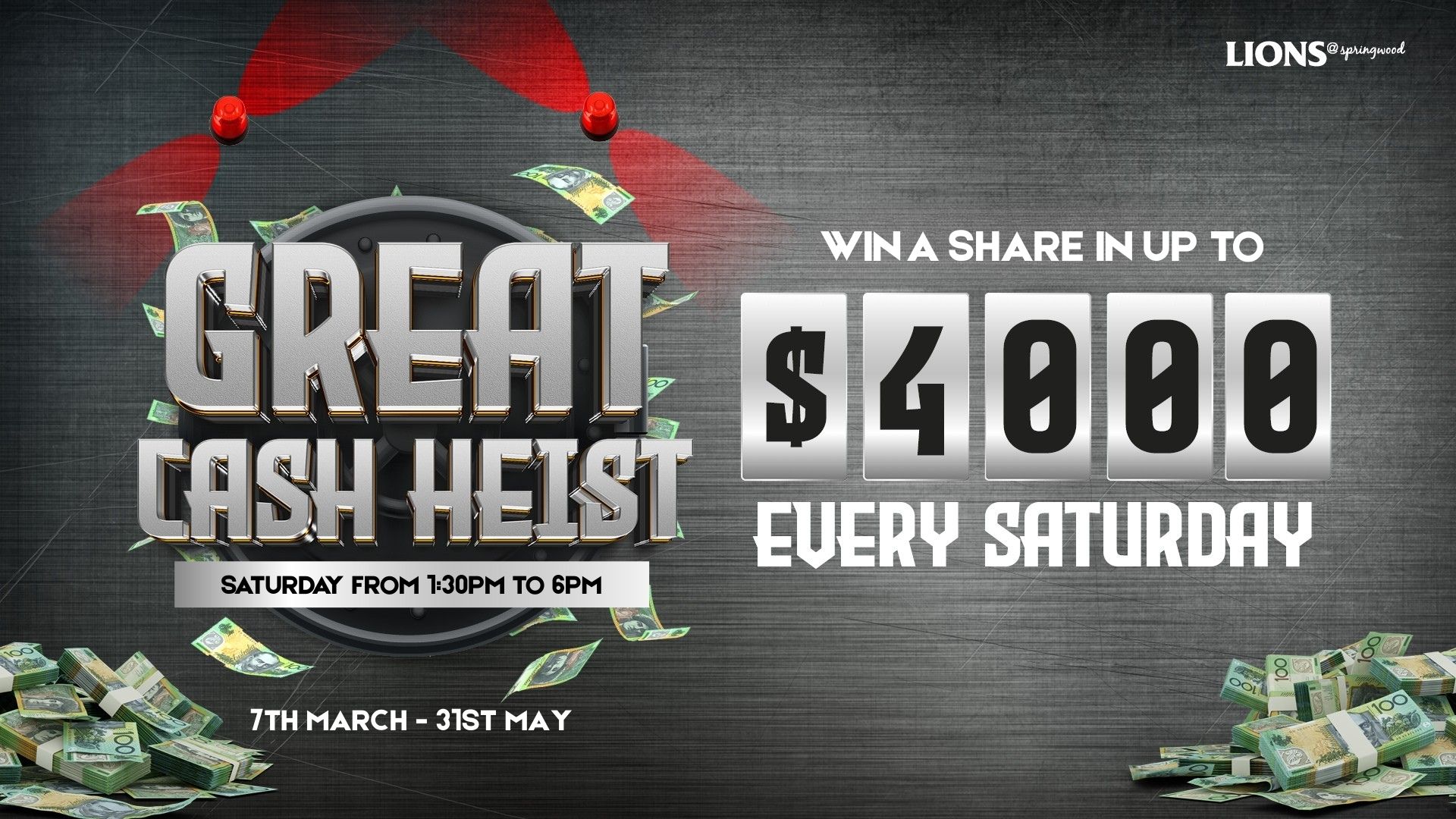 Saturdays | 7 March – 31 May 2026 Great Cash Heist Promotion. Win a share in up to $4,000 CASH! Draws every Saturday from 1:30pm–6pm. Eat, drink, swipe and play... Read more »