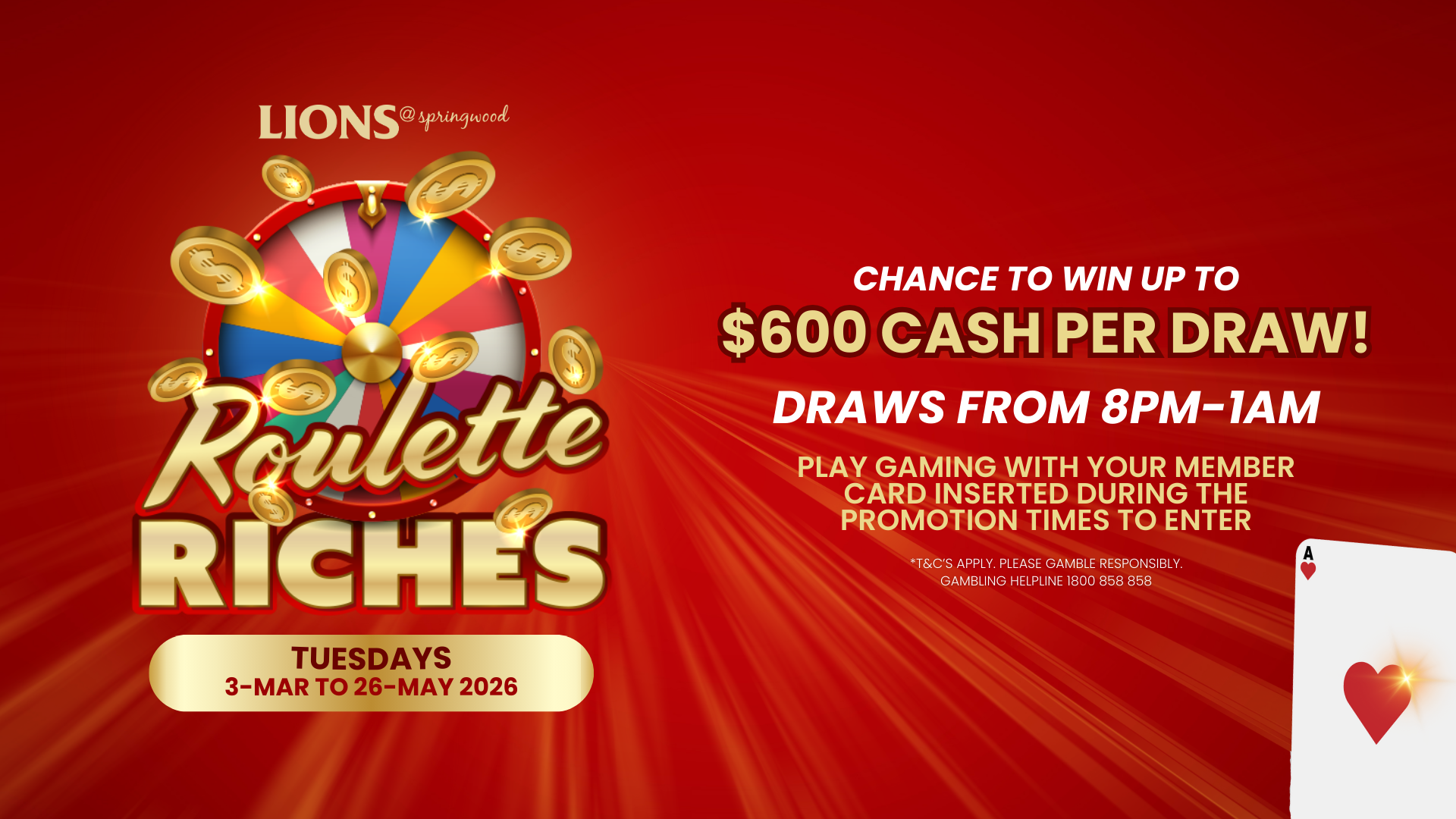 Tuesdays | 3 March – 26 May 2026 Roulette Riches Gaming Promotion – Lions@Springwood Chance to win up to $600 cash per draw Draws every Tuesday from 8pm–1am Play the... Read more »