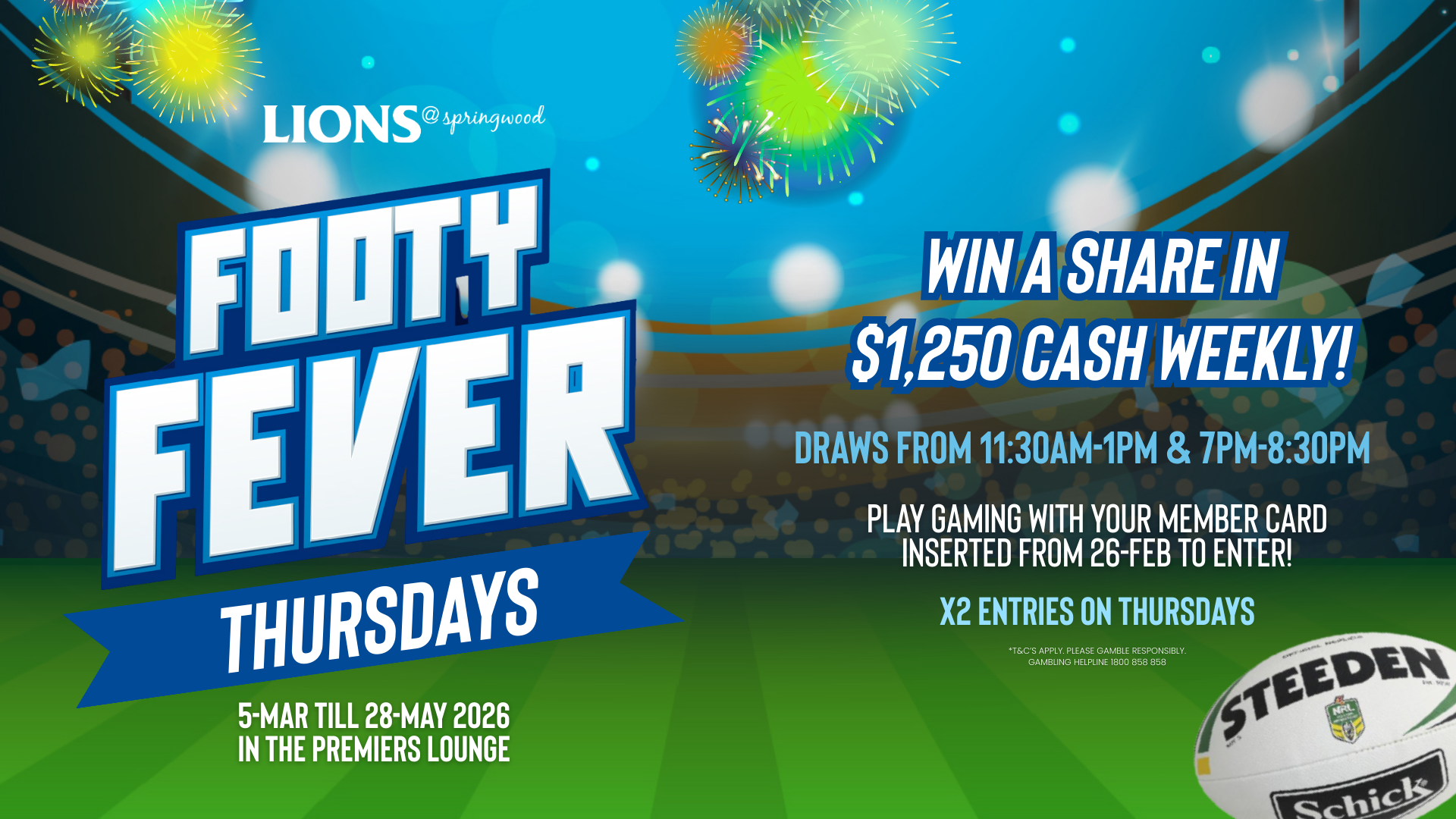 Thursdays | 5 March – 28 May 2026 Footy Fever Promotion in The Premiers Lounge. Win a share in $1,250 cash weekly. Draws every Thursday from 11:30am–1pm and 7pm–8:30pm. Play gaming... Read more »